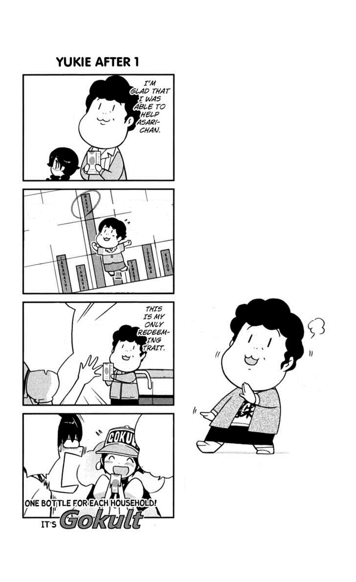 In the last panel, Yukie is thinking about the Gokult business and that she may want to hand it down to her "daughter" Haqua in the future. During a meal, Yukie asks why Haqua hasn't learned to use chopsticks. Haqua replies that she is quite old already, older than Yukie. "One bottle for relationships! It's Gokult!"