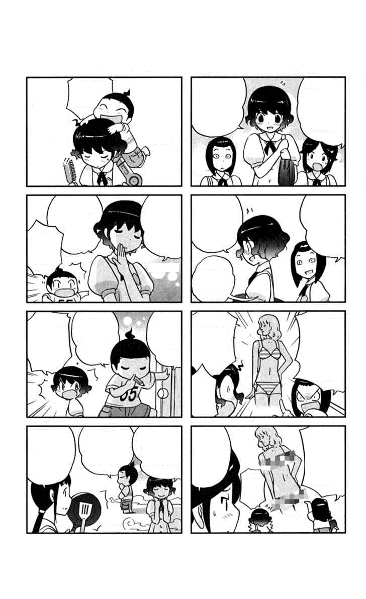 In the first panel, Minami's friends (Akko and Saito) asked if she's going to join swimming team in high school which she confirm. Then Saito teases her by telling that she heard high school swimming members wear bikini while the senior has only stickers to cover the important bits. Minami then freak out after hearing that, but Akko then tell Saito to stop. In the next panel, Minami were think that she's going to be a high school student soon so she need to stop argues with her brother, while her brother annoyed her. She then compliments to her brother that he so energetic, which makes he very surprises but he immediately response that she acts like she already grown up which his sister replied instantly too. The duo's conversation eventually interrupted by her mother.